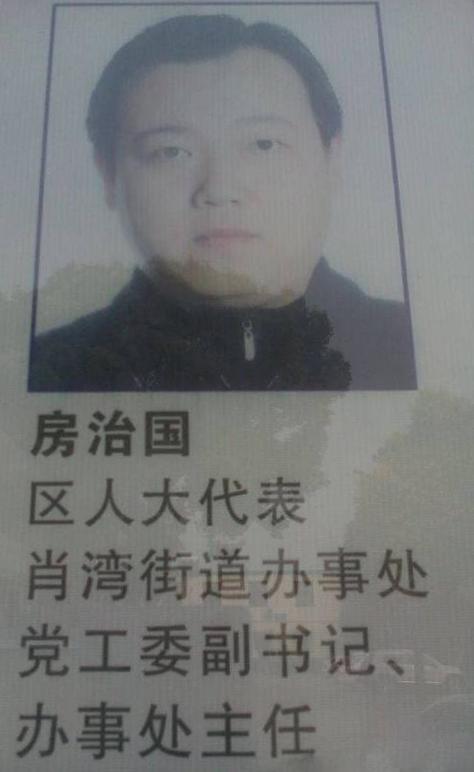 张俊普向澎湃新闻提供了一张她在肖湾派出所拍摄的街道相关负责人的介绍。其中,一张名为房治国的照片下方,写有“区人大代表、肖湾街道办事处党工委副书记、办事处主任”等职务,照片中男子与视频中踢人男子高度相似。