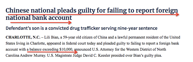 2019年7月8日,住在北卡夏洛特市的59岁中国公民Lili,出现在联邦法庭认罪。她持有美国绿卡,承认在中国境内某金融机构,有超过1万美元的账户,且未向财政部上报外国银行和金融帐户表格(Foreign Bank and Financial Account Form,FBAR),继而遭到联邦起诉。