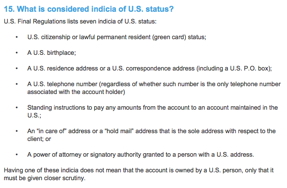 特别提醒:如果你只拥有其中一项标记,并不意味着你的账户符合“美国人身份”,但会提醒国税局必须给予更仔细的审查。一旦你的账户符合FATCA认定的“美国人身份”,无论是在中国、英国、法国,都可能都将逃不出美国税务局(IRS)的监控范围。
