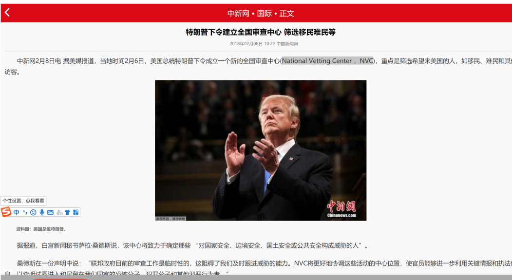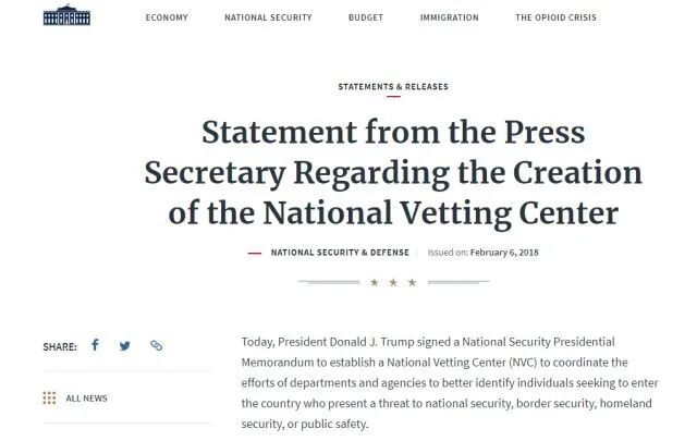 2018年2月6日,美国总统特朗普签署了一项国家安全备忘录,要求相关部门建立一个国家审查中心,进一步加强筛查想要进入美国的移民和旅行者。