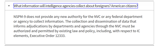 NSPM-9没有为NVC或任何联邦部门或机构提供任何新的收集信息的权限。必须通过现行法律和政策(包括就IC要素而言,第12333号行政命令)授权和许可,通过NVC收集和传播用于告知各部门和机构裁决的数据。