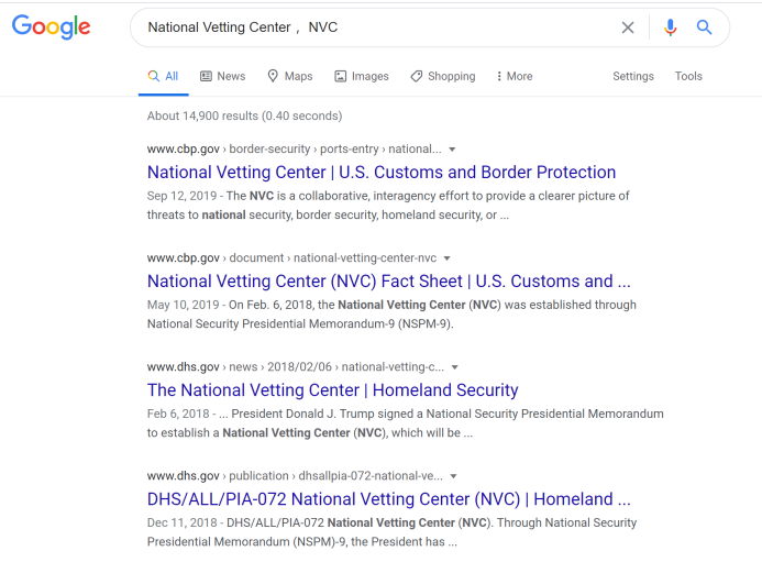 在Google搜索“National Vetting Center,NVC”,跳出来的内容就回答了雷锋君的第一个疑问。