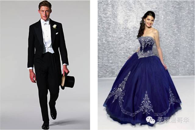 男士: 要穿晚礼服(Tuxedo),前襟领子是黑缎面的,配白衬衫,黑领结,黑腰带,黑袜子,黑鞋。裤子两侧夹缝有和领子同面料的黑缎夹条。