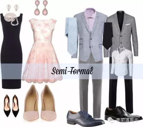 可以是晚礼服、不拖地的四分之三长礼服或者是考究的晚宴两件套(dressy separates),和Formal相配的小包和鞋子。项链、耳环等首饰的真假无所谓,但是要闪亮,戴手镯而不是手表。