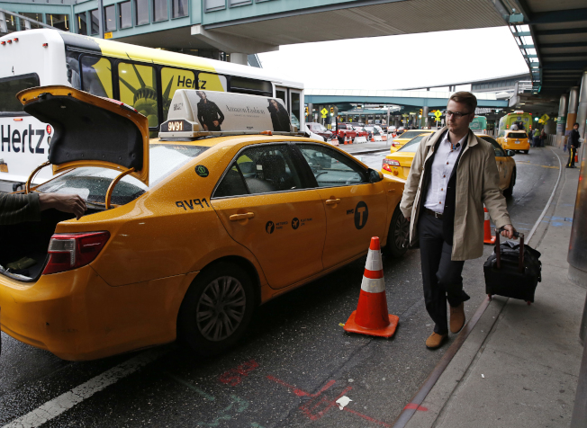 在美国各地机场搭出租车回家,对接机车辆收取多达五元的附加费,而这笔费用通常直接转嫁给乘客。图为乘客在纽约拉瓜地亚机场搭乘出租车。(美联社)