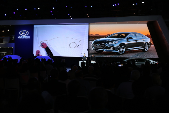 北美市场份额逐步与丰田、本田等日系车一别苗头的现代,此次更把其主打竞争系列“Sonata”的2018款新车发布会开在此次纽约国际车展上,与同级别的丰田凯美瑞、本田雅阁叫板竞争的雄心勃勃。发布会中,现代以设计师现场手绘Sonata 2018款设计图的新颖形式来介绍此车。新Sonata争夺北美消费者欲望强烈,由现代汽车在加州的设计工作室打造更贴近美式审美的外形。首席设计师Chris Chapman指出,全新的向下流动式格栅,侧面外貌更具自信,尾灯也更简洁苗条,整体外形更显动感,提供“令人振奋的视觉外观和独一无二的特性”。