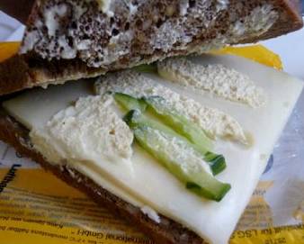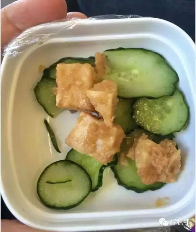 @艾米丽(Emily Puddifer):“中国航空上的开胃菜——黄瓜和鸡肉味的夹心饼。”