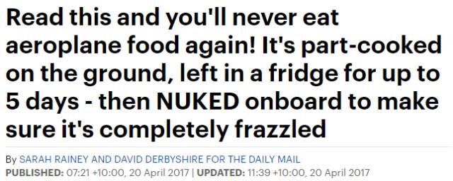 震惊!据每日邮报报道,我们每次吃到的飞机餐,其实已经在飞机上的冰箱里放了五天了!!最后你吃到的食物是五天后微波炉加热的食物!!