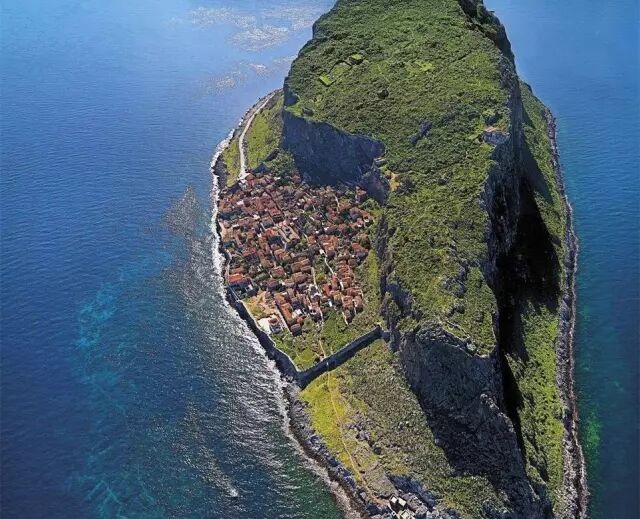 莫奈姆瓦夏村。位于希腊的莫奈姆瓦夏岛上。全村的人都生活在岛屿一侧。这个小岛在1700多年前与大陆还是相连的,后来因大地震脱离大陆,形成独特景观。别看岛屿不大,却有2000多年前的遗迹。