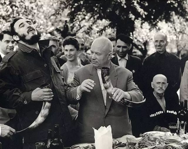 1963年,斯大林的故乡格鲁吉亚。赫鲁晓夫和卡斯特罗人手一个牛角杯,痛饮一杯伏特加。