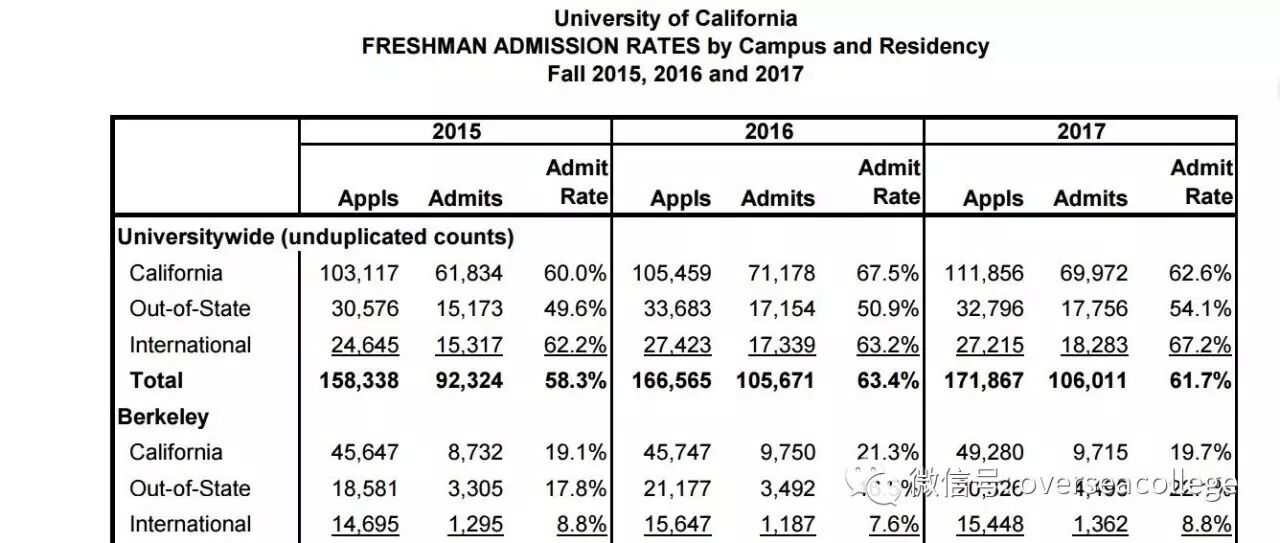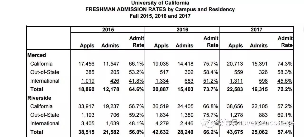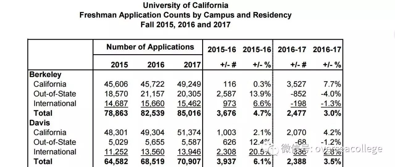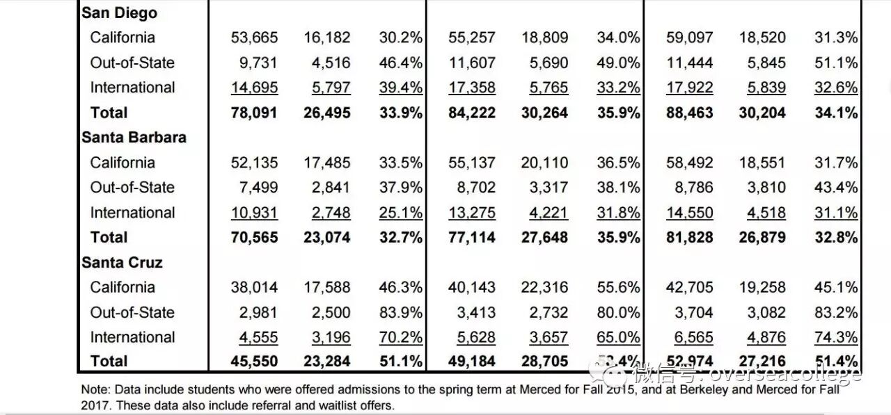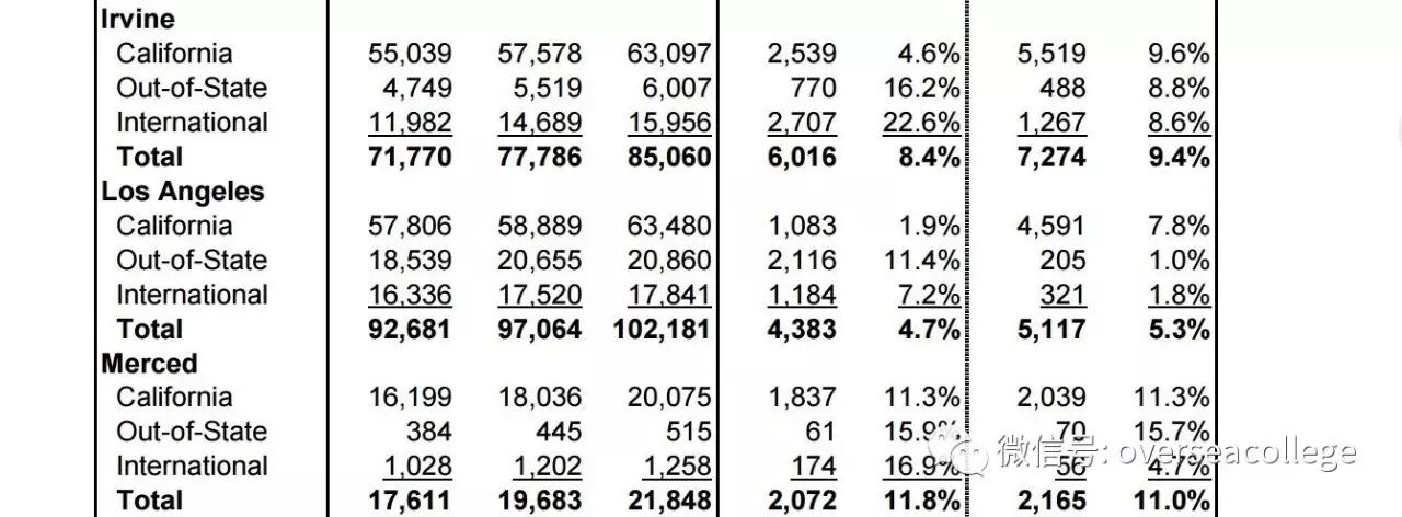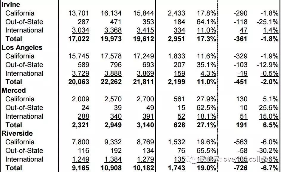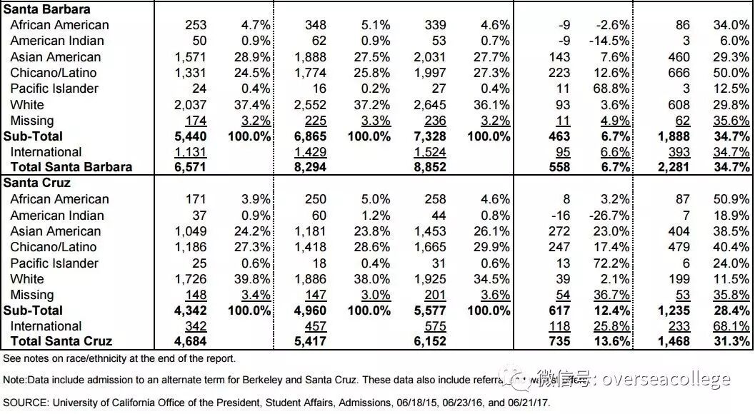 这个表格主要看各校区国际学生(International)录取情况,比2016年录取国际学生增加的校区有:Berkeley、Irvine、Los Angeles、Merced、Riverside、Santa Barbara和Santa Cruz;比2016年录取国际学生减少的校区有:Davis和San Diego。
