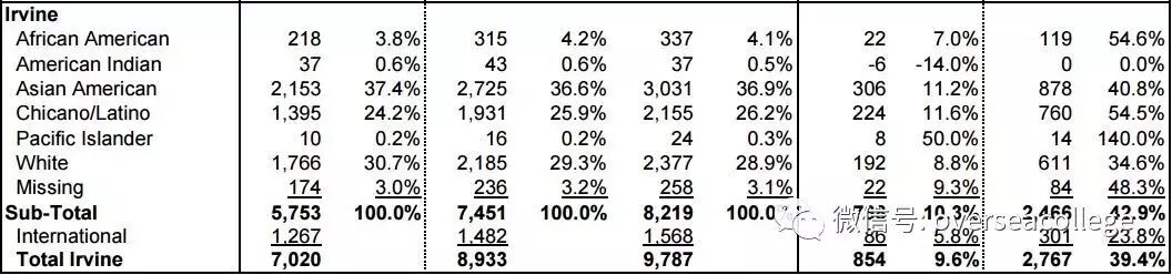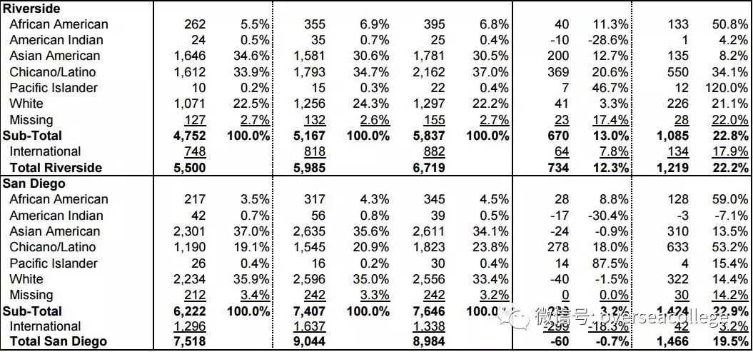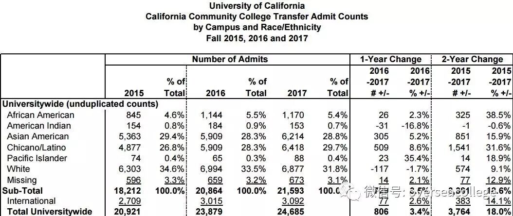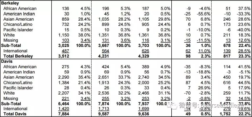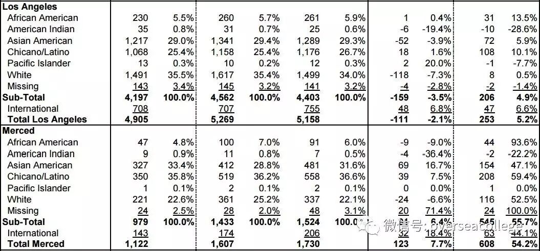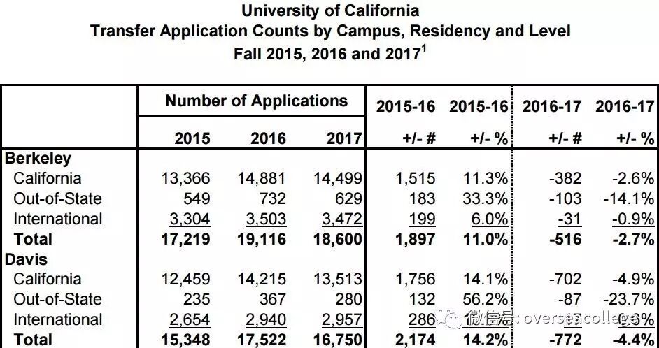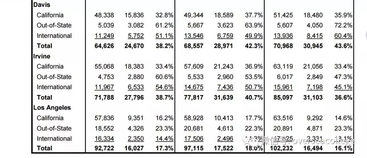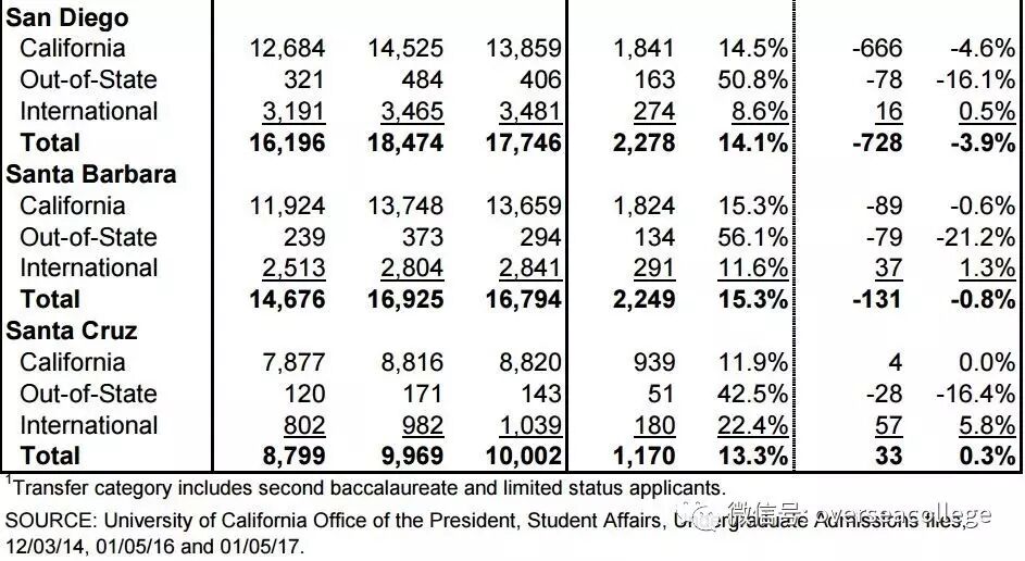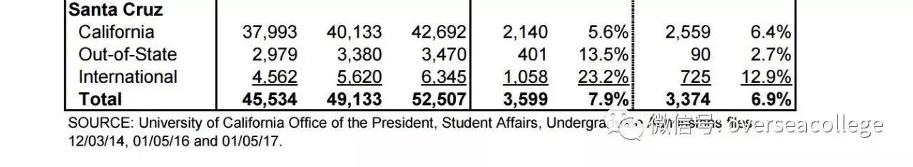 这个表格主要看各校区国际学生(International)录取情况,比2016年录取国际学生增加的校区有:Berkeley、Irvine、Los Angeles、Merced、Riverside、Santa Barbara和Santa Cruz;比2016年录取国际学生减少的校区有:Davis和San Diego。