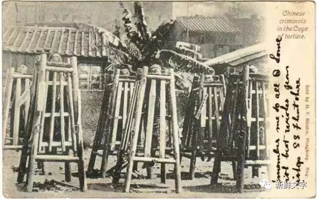 八国联军明信片。死囚笼。被关的死刑犯活不过三天,因为他们的双脚被腾空。