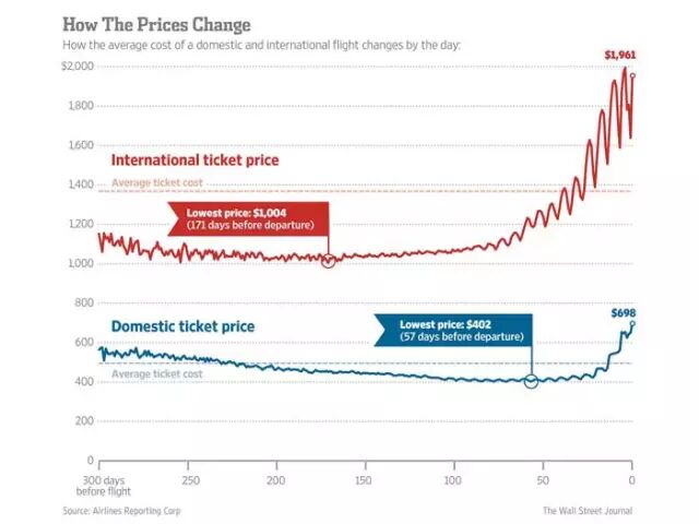 一般来说,出发日前一个月,机票价格开始稳步上升,出发前两周起,价格将会大幅飙升。一般美国境内航班机票的涨幅是这样的: 出发前30至20天每天涨$ 2 出发前20至14天每天涨$ 5 从出发前14天起至出发日期为止,每天涨14美元。