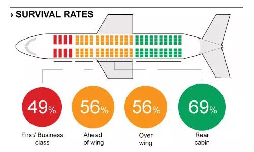 想要安全飞机尾部,机翼后缘后面的过道座位(Aisle Seat) 。据统计,万一撞机的话,坐后面的人比坐前面的生存率要高40%;而坐在过道座位上则可以在逃生时撤得更快。