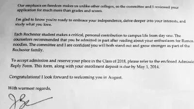 美国罗切斯特大学的录取通知书。王同学因吃遍亚洲所有泡面被该校成功录取。