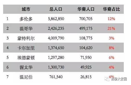华裔数量占总人口的5.1%,排在所有族裔的第七位,前六位分别是加拿大裔,英国裔,苏格兰裔、法国裔、爱尔兰裔和德国裔。而同样是移民大国的美国,华裔所占比例不到1%。