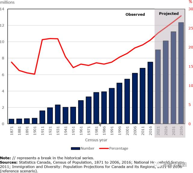 移民正在改变加拿大人口结构。按统计局的预计,移民占总人口的比例将持续上升,至2036年将接近30%。