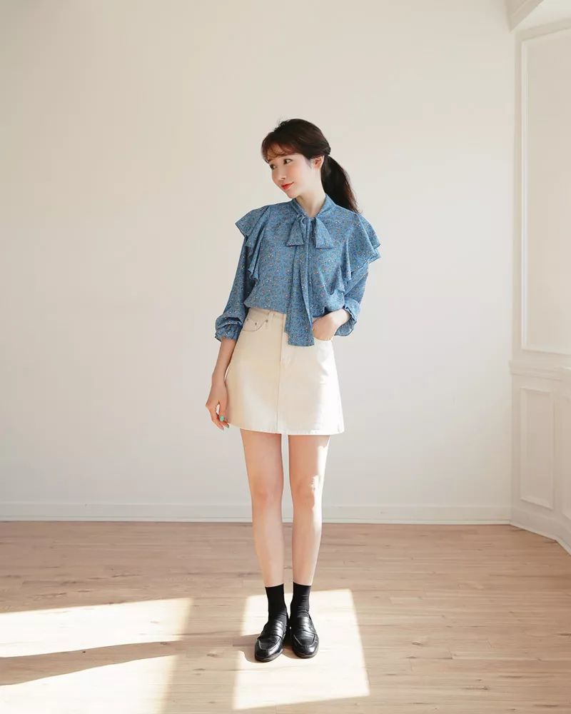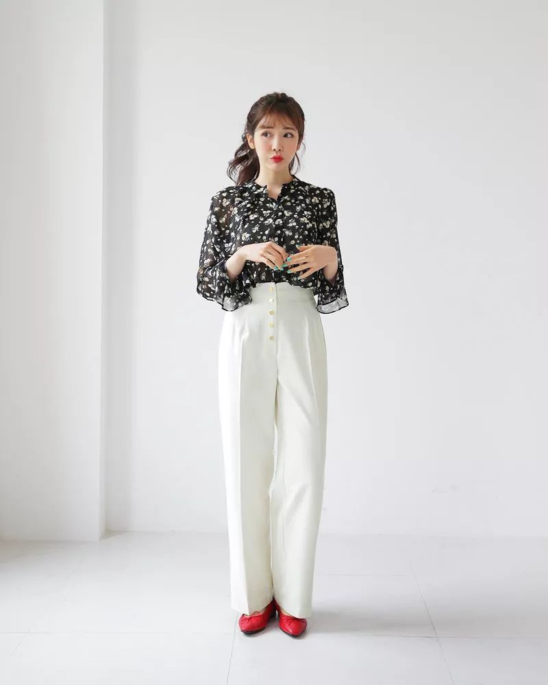 浅色碎花衬衫十分的俏皮和显嫩,很有学院少女气质哦。搭配一款个性的高腰喇叭裤,再配上舒适的平底鞋或球鞋就十分时尚和出众了。