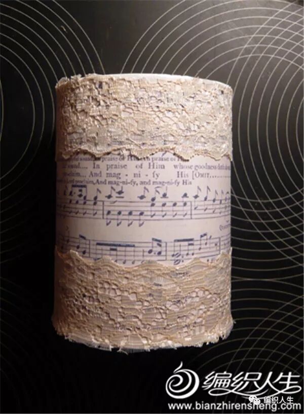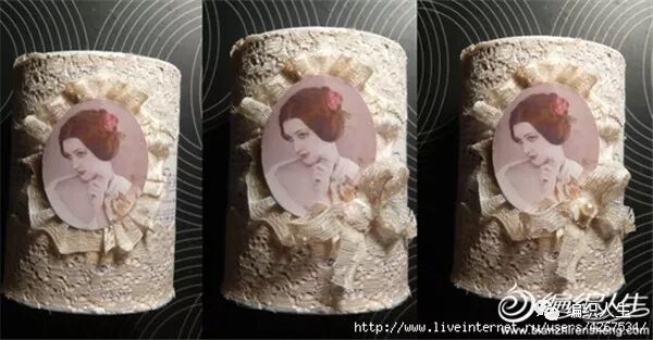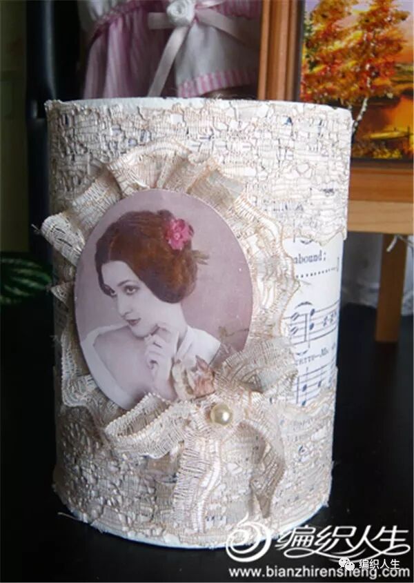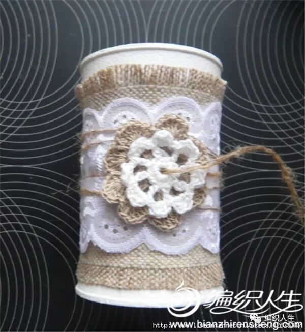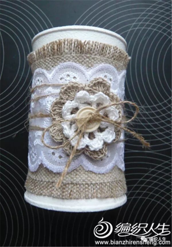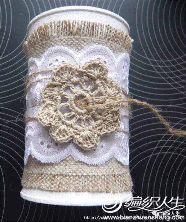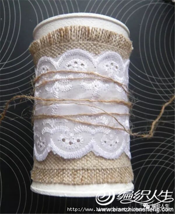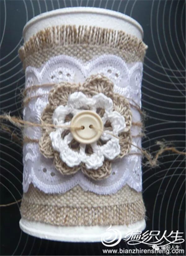 材料准备:广口瓶、麻布、蕾丝花边(也可以细针细线自己织喔)、纽扣、珠子、麻绳、毛线编织的花朵、复古的小画或照片