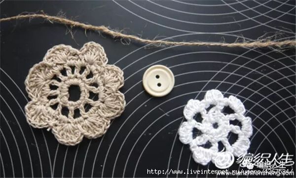 下面按步骤将钩织的花片、麻绳与扣子装饰上