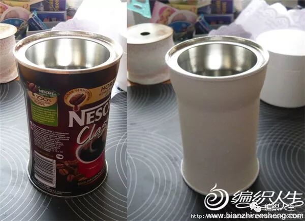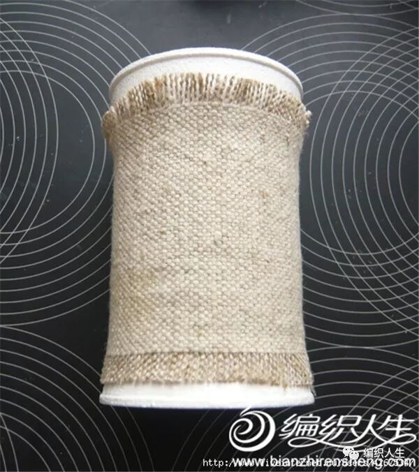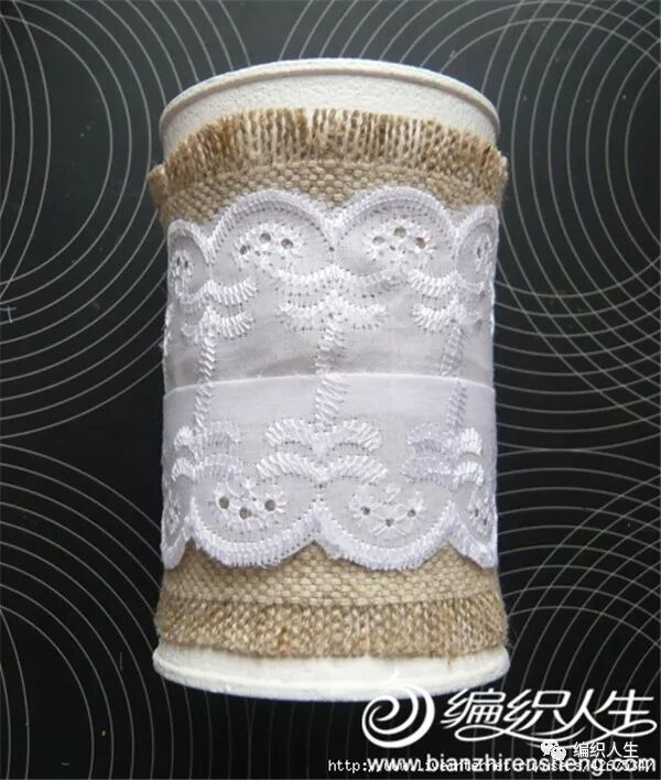 用手工胶将麻布粘于罐子上,注意涂胶时把麻布的毛边涂上一部分粘上喔