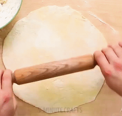 然后,在撵好的大面饼上,像盖章一样,即可迅速戳出数十个大小一致的饺子皮,个个形状规整,比机器压出来的饺子皮还漂亮!