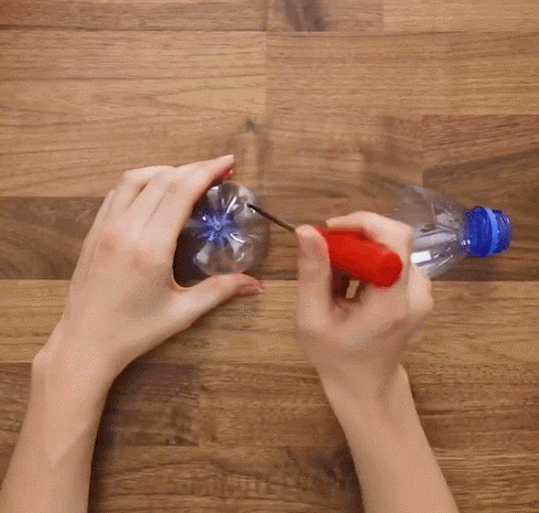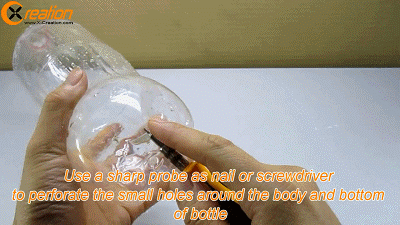 用铁锥在塑料瓶瓶身和瓶底均匀地打上一些小孔,小孔尽可能密集一些。