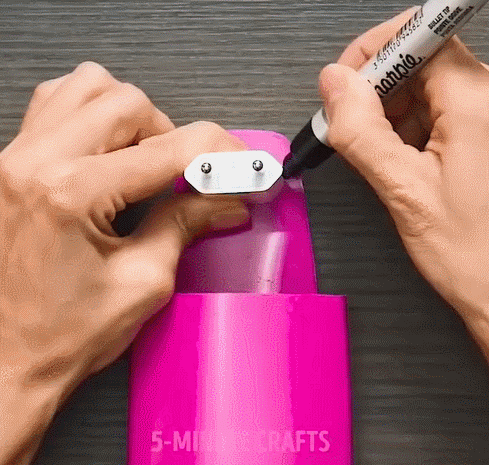 第三步,找一个矿泉水瓶的瓶口,对准大号塑料瓶,用记号笔画上3个瓶口大小的圆形标记。
