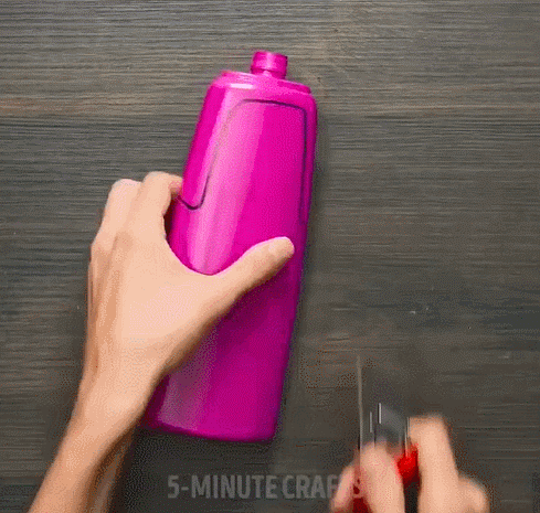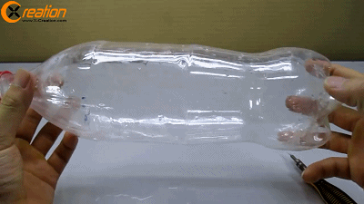 先用笔在塑料瓶上画好标记,切掉一小截瓶口,同时裁剪掉瓶底座。