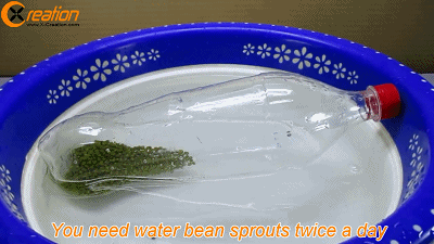 每天早晚,将装有绿豆的塑料瓶拿出,浸入到水里,泡上5分钟左右,一天两次,使豆子保持湿润状态,促进其发芽生长。