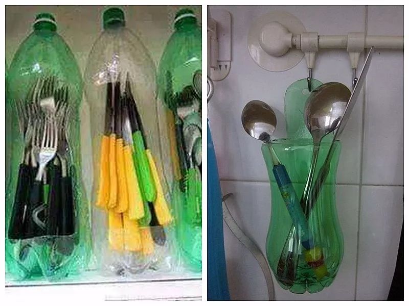 厨房里的刀叉筷子等零碎餐具,常常堆满整个橱柜,将塑料瓶剪成桶状,分类将餐具收纳整齐,料理台立刻会焕然一新,再也不用费心整理。连买收纳盒的钱,都省下不少,聪明的主妇赶快学起来!