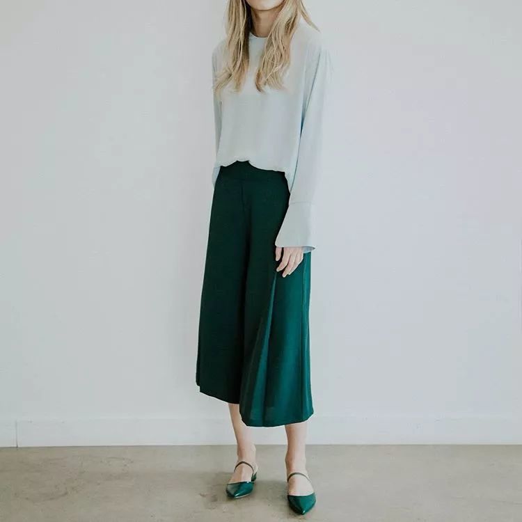 袖子的衣柜里,蓝色占据半壁江山,但这两年蓝色的好姐妹——绿色,也蛮吸引我的。最近天气湿热,这身绿色渐变就非常喜人了——一眼看去,颜色本身的清凉效果杆杠的。下半身其实是阔腿裤但换成半裙也毫不违和,看的出来,单品材质都是轻薄飘逸垂感好的那种(像雪纺),有显瘦效果,也可以考虑换成棉麻材质——那就是另一种风格了,以及,绿色尖头鞋也加分不少,颜色呼应下装,尖头拉长小腿——小腿较为短粗的建议换成带跟款:
