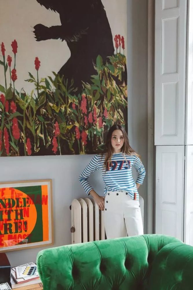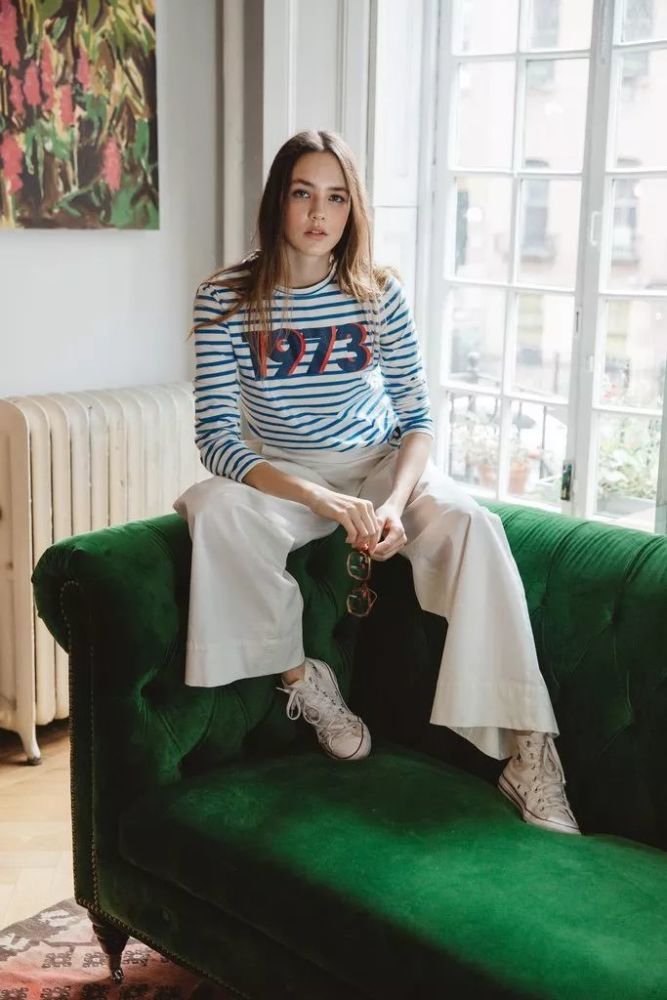 袖子个人非常喜欢的一种穿法——白底条纹(条纹颜色随意)+白色裤子,干净高级好搭。不过紧身款的白色裤子一般不好穿,建议穿直筒/阔腿的白裤子,下面这身是蓝白条纹+白色阔腿裤+白色帆布,条纹上多了数字1973,偏学生略复古,条纹换成常规款,鞋子换成单鞋/凉鞋的话,年龄感就会比较模糊(也就是不挑年龄的穿法啦):