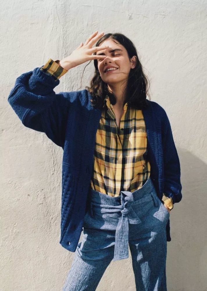 同一件格子衬衫,搭配换成更知性,成熟感也较强的深蓝针织开衫(春夏可脱掉)+浅蓝棉麻直筒裤,跟上面一套比,就算都是同一件衣服和蓝色搭配,材质软硬、颜色深浅不一的话,气质差异也相当大,可以好好开发一下黄色格子+蓝色这个组合——应该可以玩出很多花样: