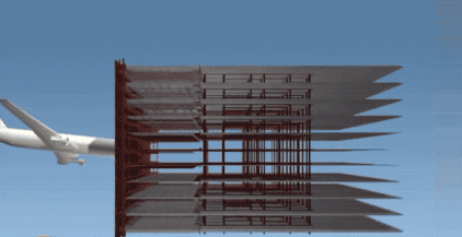 飞机的部分残骸从大楼东侧与北侧穿出,