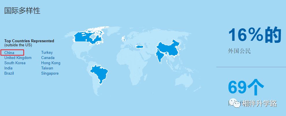 2、新班级中录取人数最多的留学生是中国,加拿大,英国,巴西和印度。11%的新生是外国公民,创历史新高。中国排在首位。不得不佩服咱们大中国,人口数量与质量全部占优。
