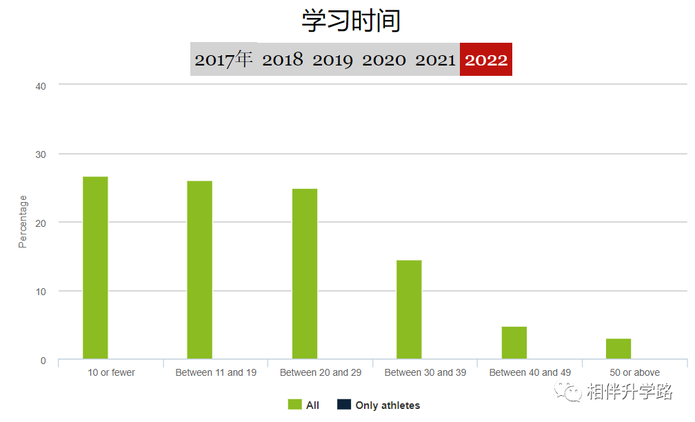 学习时间极长(40个小时以上)的学生占比还不到10%。