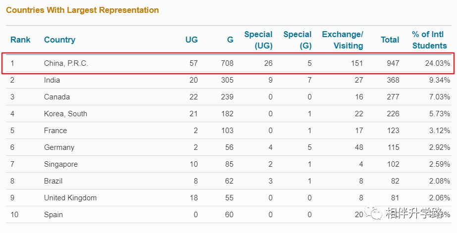 3.在所有国际学生中,中国学生的比例最高。可见中国留学生数量最多,而生源质量也颇高。