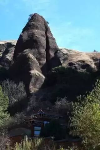 更令人不可思议的是四周的山峦,不是林木森森就是芳草萋萋,唯有这公母二石,赤条条裸露着红褐色的岩石,母石顶峰却又长着一棵不知名的古树,四季常青。如阳刚挺拔直刺天穹,阴柔含媚敞开心扉。