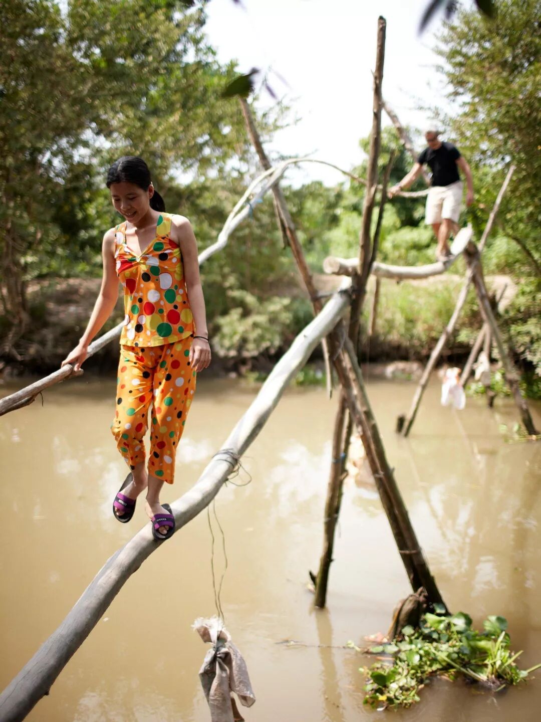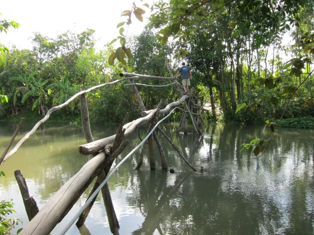 現在湄公河三角洲有着各種橋樑。 這座獨特的橋樑,雖然看起來只有一隻猴子可以穿越,但是,實際上是當地人的流行交叉點。 通常由一条竹子製成,猴子橋的名字來自於人們在穿越時必須採用的滑稽姿勢而得名。
