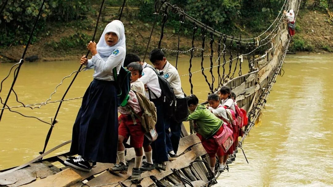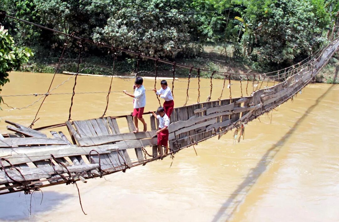 在印度尼西亞的這座橋神秘橋上,即使是訓練有素的衝浪者和滑板運動員也不是那麼容易走過這座橋,非常考驗你的膽色和平衡,這座橋似乎已經不能再使用,可能不應該被任何人使用,基於某種原因,這似乎並沒有打擾這些學童還是要冒險經過這座橋。