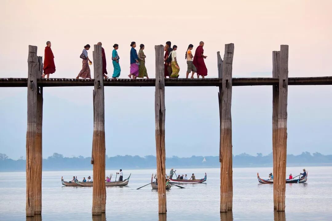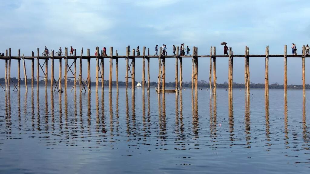 緬甸的 U Bein 大橋穿過 Taungthaman 湖。 它橫跨大約四分之三英里,並於1850年使用一種叫做柚木的熱帶硬木建造。 因為沒有任何形式的支撐,也沒有任何東西可以沿著兩側固定,所以,這座橋非常危險。