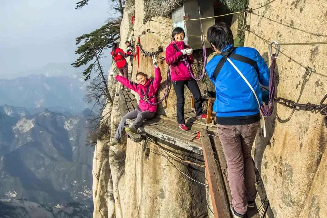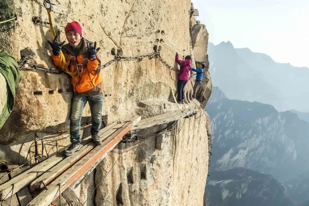 你必須有膽量穿過這座“橋樑”。它由中國華山邊緣的木板組成。 它高達7,000英尺,非常可怕。 要穿過木板,您可以將線束連接到沿山脈運行的繩索上。 從那裡,你可以在你洗牌時抓住鏈條。 如果有人來到另一個方向,您或其他人可以鬆開線束並在您通過後重新連接。