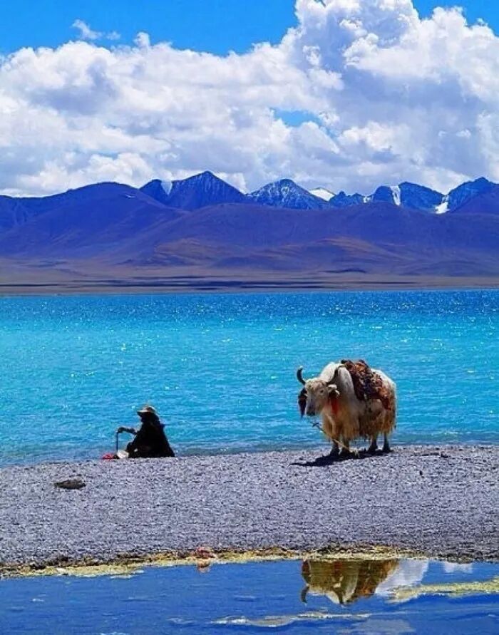 风和日丽的时候,巍巍的雪山倒映在湖水中,仰望蓝天白云,一切都是那么美好。