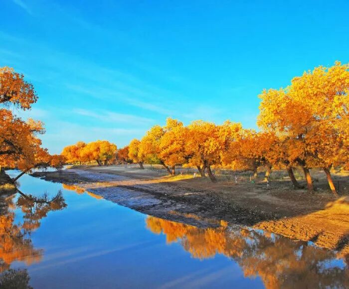 秋季的额济纳一片金黄,蓝蓝的天空飘着朵朵白云,湖水中倒映着胡杨林。