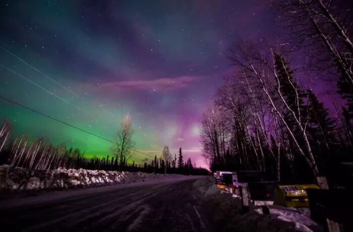 想在零下40°的漠河看着远处的极光,北极光在北面天空开始出现时,是一个由小至大、颜色变幻不定的光环,色彩在最灿烂艳丽时,光环慢慢移向东边,由大变小,逐渐消失。