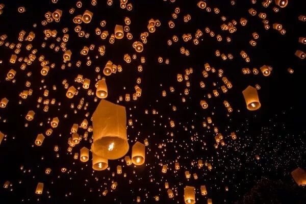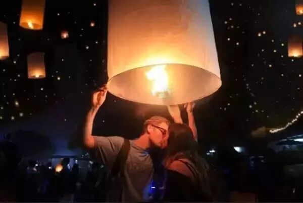在水灯节期间,水面上都会飘满烛光,照应着男女幸福的背影。当万盏天灯一起升空,漫天灯火摇曳,惊艳银河。