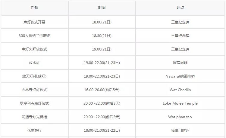 主要的活动地点则集中在塔佩门、美萍河、三皇纪念碑和各大寺庙。时间参照下表,你可以据此来规划自己的行程。