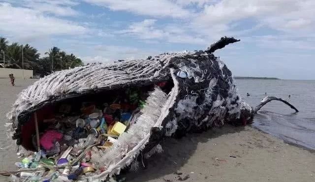 为了提高对此的认识,绿色和平组织的菲律宾人在南马尼拉的海滩上装了一条死鲸的复制品。整个装置都是在海水中发现的塑料残骸中制成的。